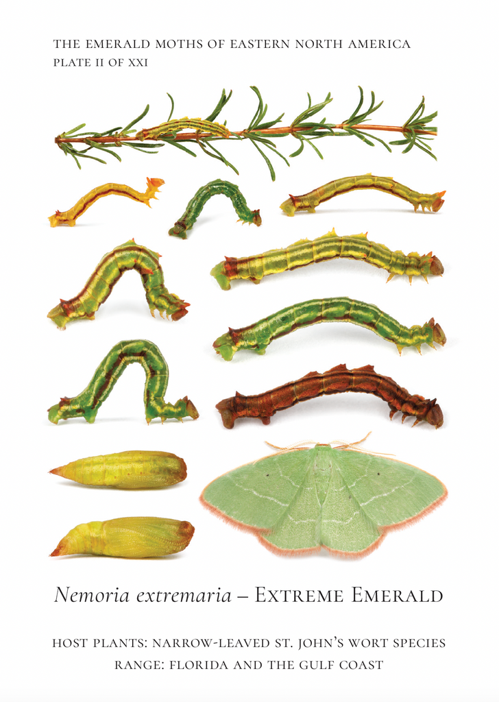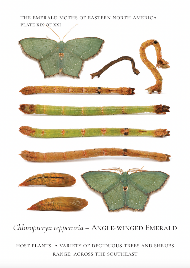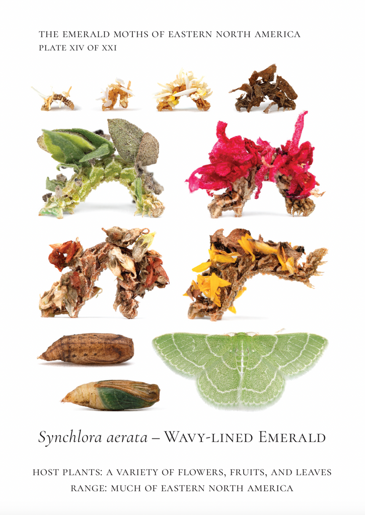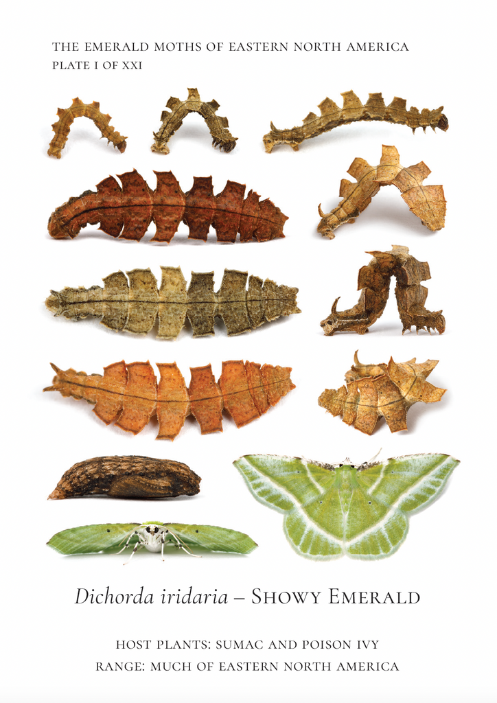 Our “Verdant Geometry” collection features twenty-one original designs showcasing Sam Jaffe’s photographic life-history plates of emerald caterpillars (Geometrinae) from across eastern North America. Each design highlights these sculptural larvae posed with their native host plants, revealing the delicate symmetry, coloration, and posture that make this group so distinctive.